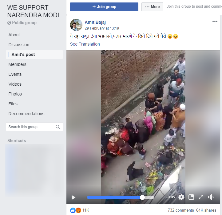 Amit Bajaj, the person who shared the video on the group, wrote, “This is the proof. They are being paid for rioting and stone-pelting. (ये रहा सबुत दंगा भडकाने,पत्थर मारणे के लिये दिये गये पैसे.)” The video is viral with the same message on Facebook.