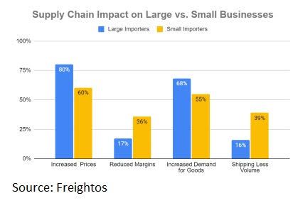 Freightos recently surveyed its small and large businesses on the impact of supply chain costs. The results of course are not surprising. The smaller companies do not have the bandwidth to absorb the price increases.