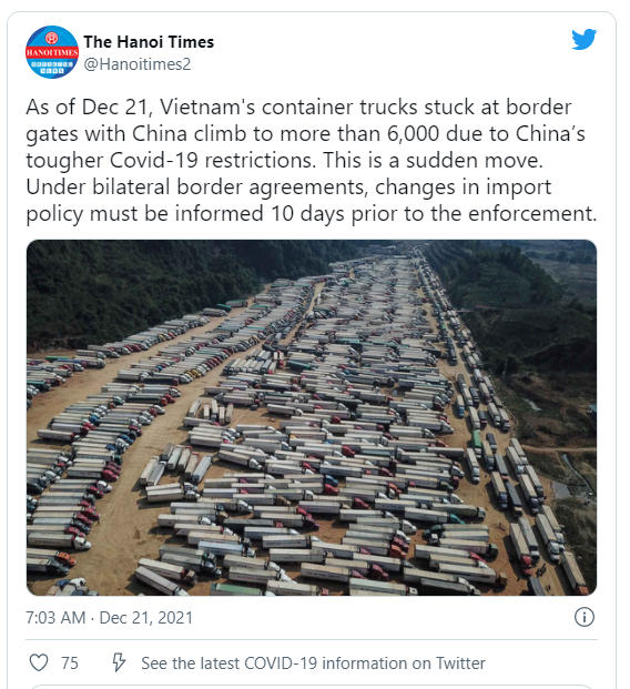 Thousands of container trucks are in the northern province of Lang Son at Vietnam’s border gates with China. On Dec. 15, China announced it was halting customs clearances at the key inland seafood trading port of the border after a positive COVID-19 case in the area. The Hanoi Times, which is controlled by the Vietnamese government, posted a photo of the congestion.