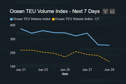 The Port of New York and New Jersey is also starting to see a buildup of vessels. The length of time the vessels are in port is contributing to this increase along with more vessels calling on the port from China. In the next seven days, SONAR is showing an 11.6% increase year over year in shipments and a 56.1% increase in ocean TEU volume.