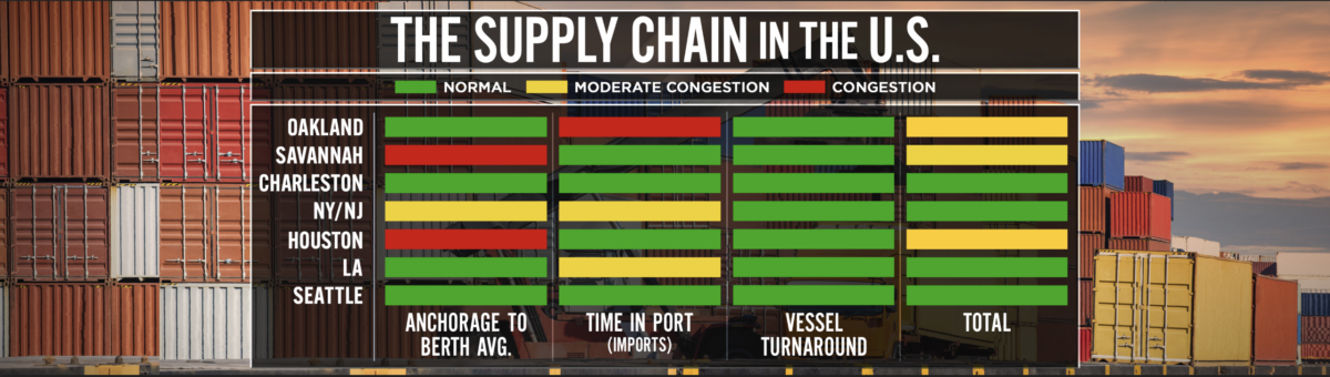 Alex Charvalias, the supply chain in-transit visibility lead at MarineTraffic, tells American Shipper, “On the U.S. side, Savannah is seeing its worst days, with an average waiting time of eight days before berthing. No signs of relief there, as well, with four times the TEU capacity waiting outside the port compared to the total TEU capacity the port is able to serve at any point of time.”