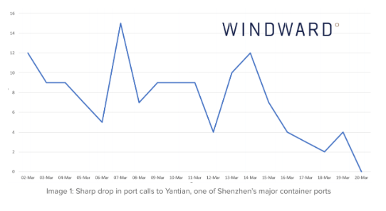 Windward posted similar disruption data, showing a decrease of 84% in the volume of container processing at the Port of Yantian.