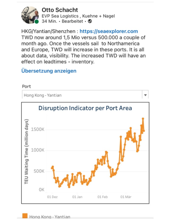 Port productivity hinges more on manpower. Otto Schacht, EVP of sea logistics at Kuehne + Nagel, tells American Shipper the disruption he posted on his LinkedIn post “is the effect of the partial lockdown in southern China due to COVID, factories closed for a week, terminals, less cargo, etc.”