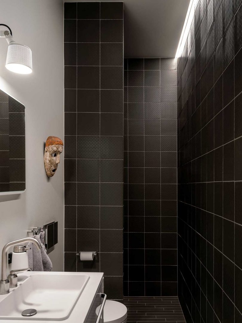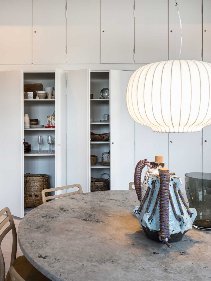 The Vipp Pencil Case includes a living room, dining room, bedroom, and bathroom that incorporates a number of Vipp’s products, including the V1 kitchen, dining table, desk lamps, coffee tables, lounge chair, and, of course, their pedal bins.