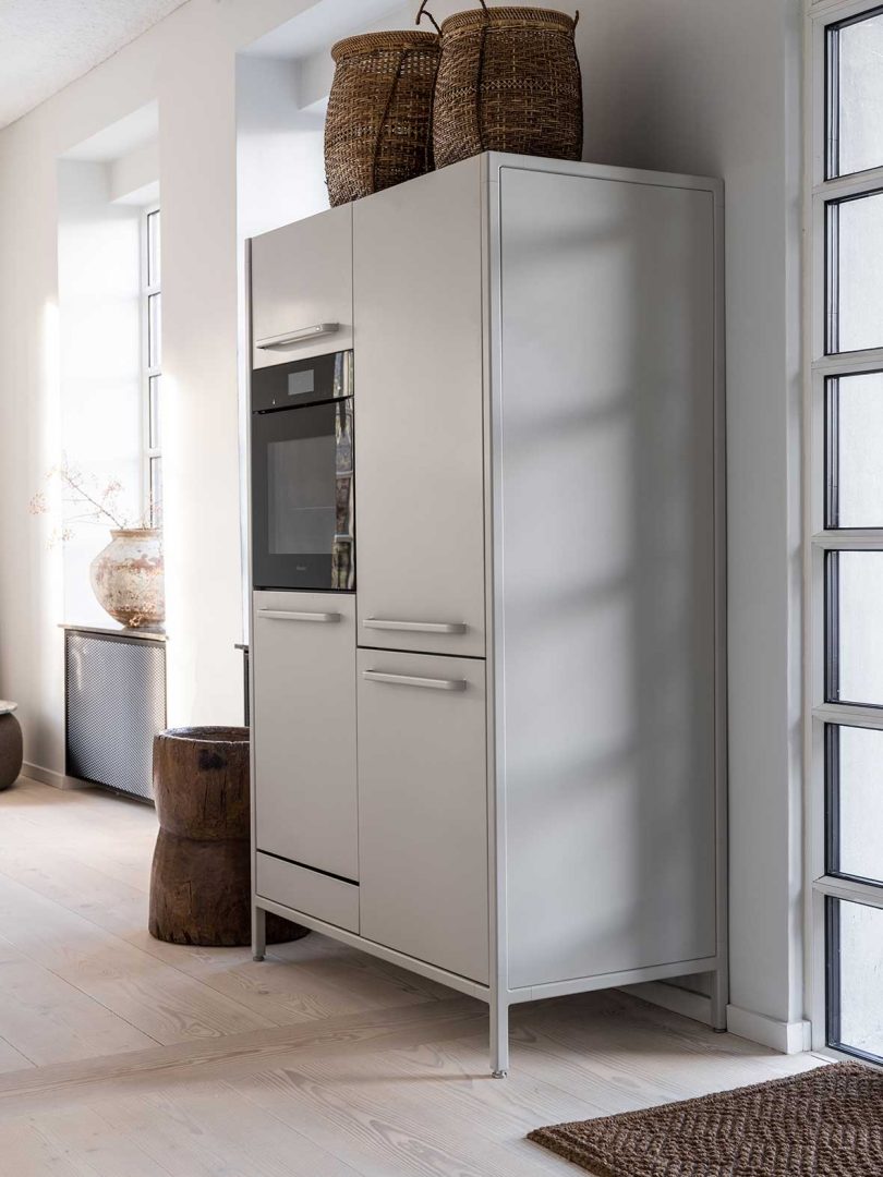 The design plays with a natural, neutral color palette featuring shades of beige and grey, along with black accents throughout. From the V1 kitchen components in warm grey to the light Kvadrat curtains, the design comes together offering a casual yet comfortable aesthetic most any visitor would enjoy.
