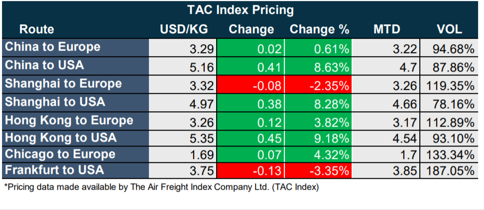 Airfreight rates from Asia are on the rise again the past three weeks. Most notable in the past week is the 8.6% increase in air cargo prices from China to the U.S., which are averaging $5.16 per kilogram. In the past three weeks, spot market rates have increased 18%. The China-to-Europe rate ticked up a half point to $3.29, according to data compiled The Air Freight Index Co.