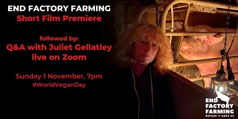 Trailblazing UK charity Viva! is offering the opportunity to join an EXCLUSIVE premiere of its short film ‘End Factory Farming, Before it Ends Us’ – which will take place this Sunday, World Vegan Day, and will include an introduction and Q&A with Viva!’s founder and director, Juliet Gellatley.