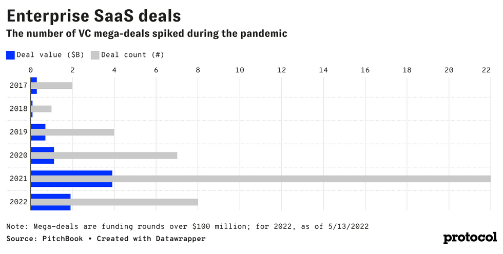When it comes to enterprise SaaS, the number of mega-deals — VC funding rounds over $100 million — spiked last year, according to data from Pitchbook. Partially driven by the onset of a pandemic that accelerated the need for everything from contact centers to supply chains to move into the cloud, the number of large VC deals tripled between 2020 and 2021. That growth has extended into this year, where the number of mega-deals has already outpaced all of 2020.