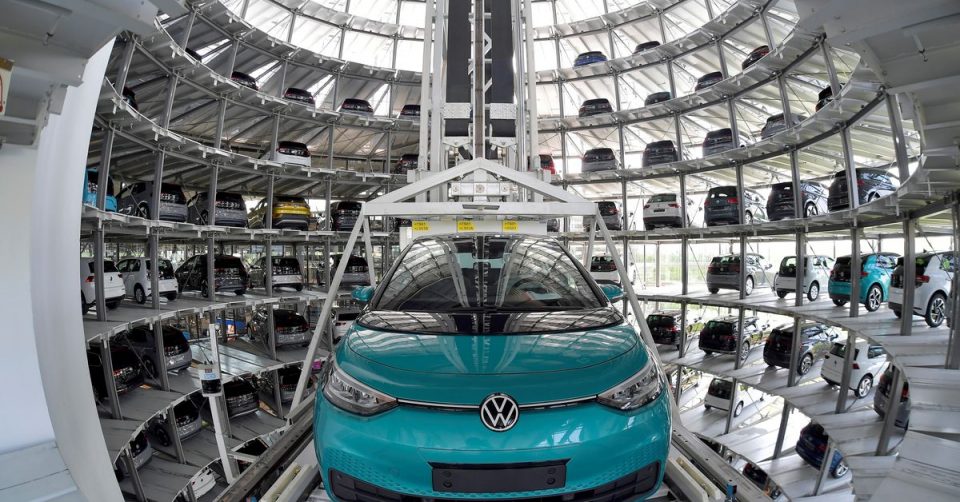 View of the depot tower of German carmaker Volkswagen’s electric ID.3 car in Dresden, Germany, June 8, 2021. Picture taken with a fish eye lens. REUTERS/Matthias Rietschel
