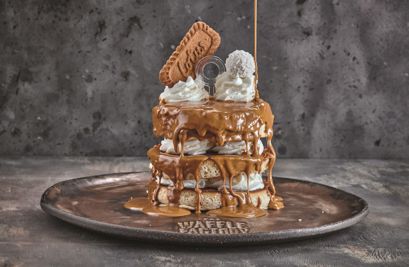 The packaging said we had received a “Self-Built Waffle” (NIS 44), which comes with two types of cream, two spreads and three toppings. There was also an Alfachlores Mount Cake (NIS 62) based on pancakes, dulce de leche and lotus cookies, but we did some mixing and matching to make our own creations. Both the waffle and pancakes were well-made and stood the test of being covered with sauce, cookies and whipped cream without getting gloppy.