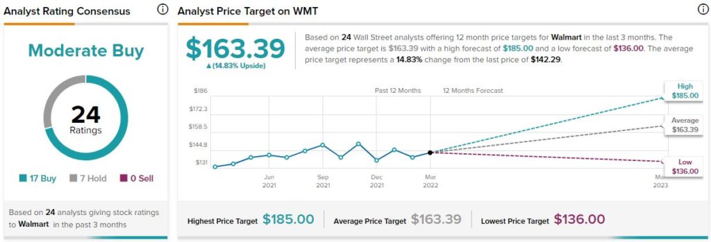 Turning to Wall Street, Walmart has a Moderate Buy consensus rating. That’s based on 17 Buys and seven Holds assigned in the past three months. The average Walmart price target of $163.39 implies 14.8% upside potential.