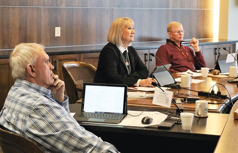 Ward County commissioners, from left, John Fjeldahl, Shelly Weppler and Chairman Jim Rostad listen to a presentation during a commission meeting Tuesday.