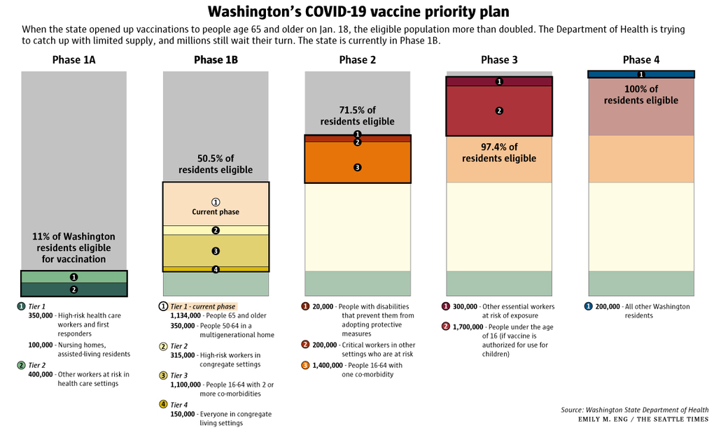 Complicating things, some local health departments limited access to older age groups, hoping to stem the demand. In King County, for instance, the health department allowed access to its mass-vaccination sites only for those 75 and up, even as the state had lowered the age to 65.