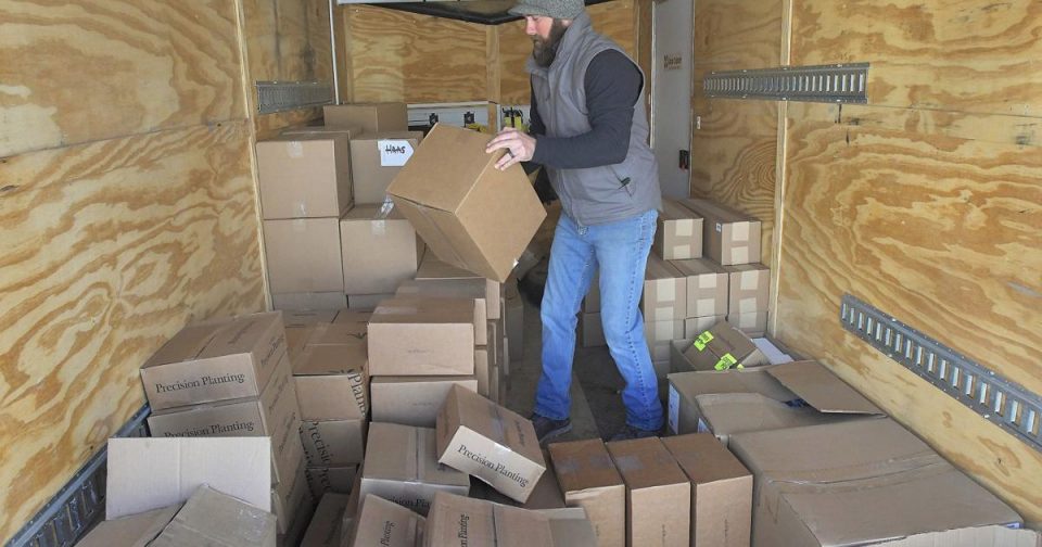 Downs-area farmer Brett Haas inventories the dozens of boxes of parts he will need to maintain planters and tractors that will be put to work during spring planting. Haas said some of the parts were delayed due to supply chain issues but expects to be up and running once weather conditions are good for planting.