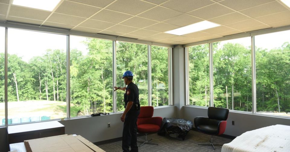 Danville Police Department Deputy Chief Dean Hairston highlights the expansive new windows for the new headquarters.
