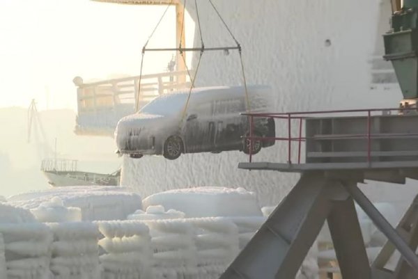 The car carrier Sun Rio was loaded with new cars in Busan, South Korea, and arrived in Vladivostok a few days later with the ship and its vehicular cargo covered in ice and snow.