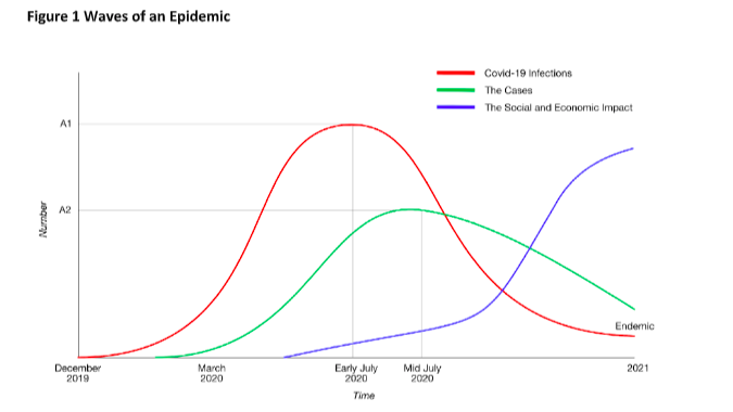 Early in my work on AIDS we produced a graph with three lines, see Figure 1. This argued there were three waves. The first the silent spread of HIV infections (this was, in the absence of treatment), followed by AIDS cases some six to ten years later. The final curve was of impact. The context of AIDS without treatment meant workers dying, children being orphaned, and elderly people being left without carers. Our first projections were deeply pessimistic, and the reality was much less ghastly than we imagined. Maybe ‘crying wolf’ was a necessary part of the response.