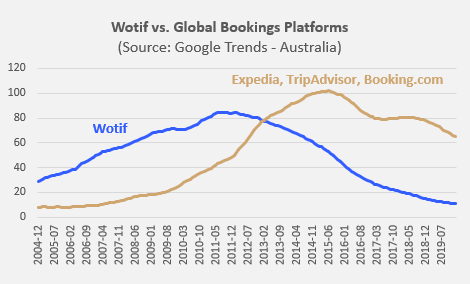 In contrast, leisure travel is often a global experience for consumers, while major hotel chains have multi-national footprints. Both these factors give hotel aggregators increasing relevance with global scale — a much more complicated model for new entrants to replicate. This was a key driver behind the decline of Wotif.com, a once-popular Australian-based booking platform whose national scale was displaced by global hotel aggregators.