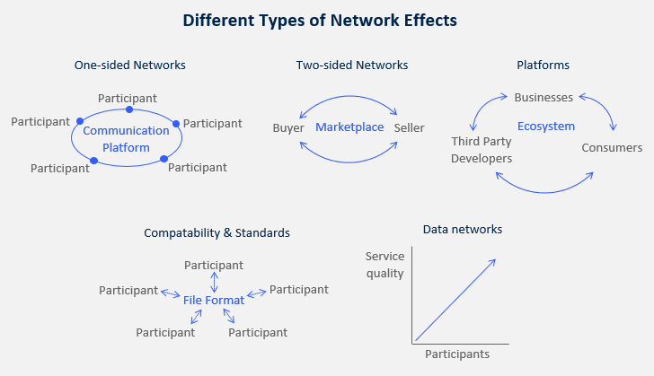 Networks come in many forms. There are one-sided networks such as communication platforms (WhatsApp), two-sided networks which are commonly marketplaces (Realestate.com.au), and platforms such as social mediums (Facebook) which experience both one-sided networks (consumer-to-consumer relationships) and two-sided networks (consumers and developers).