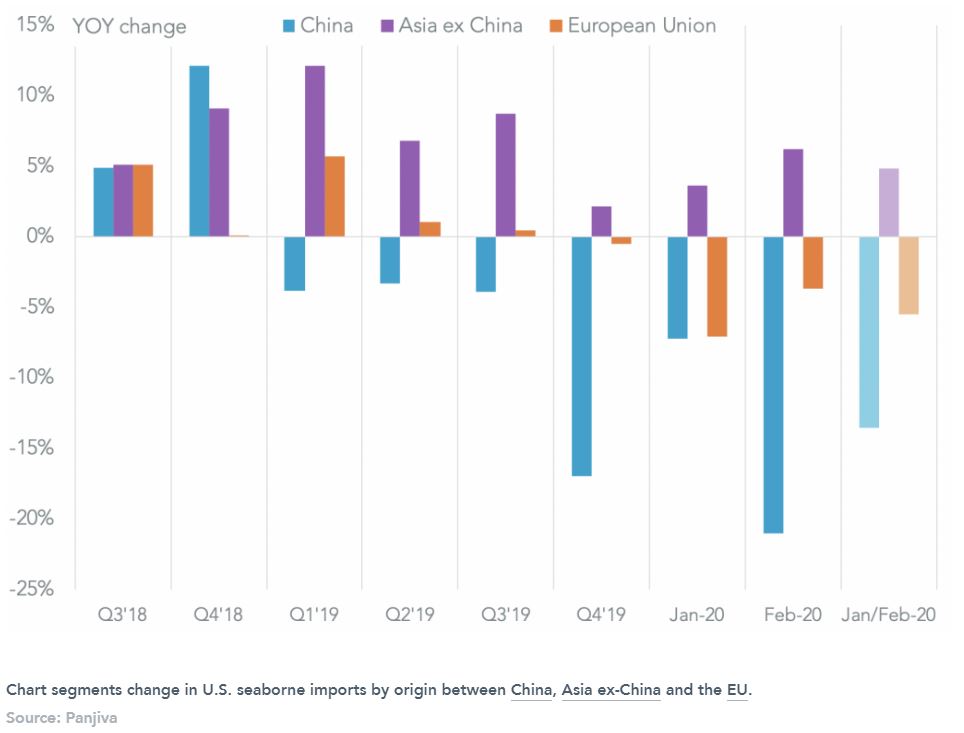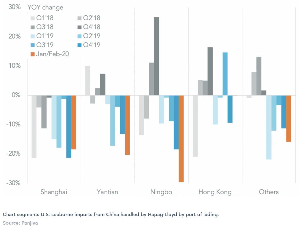 Hapag-Lloyd meanwhile has indicated there will only be an “extended period or recovery” – Panjiva’s data shows that imports from Ningbo and Yantian ports to the U.S. handled by Hapag-Lloyd fell by 29.4% and 20.3% respectively in January and February combined.