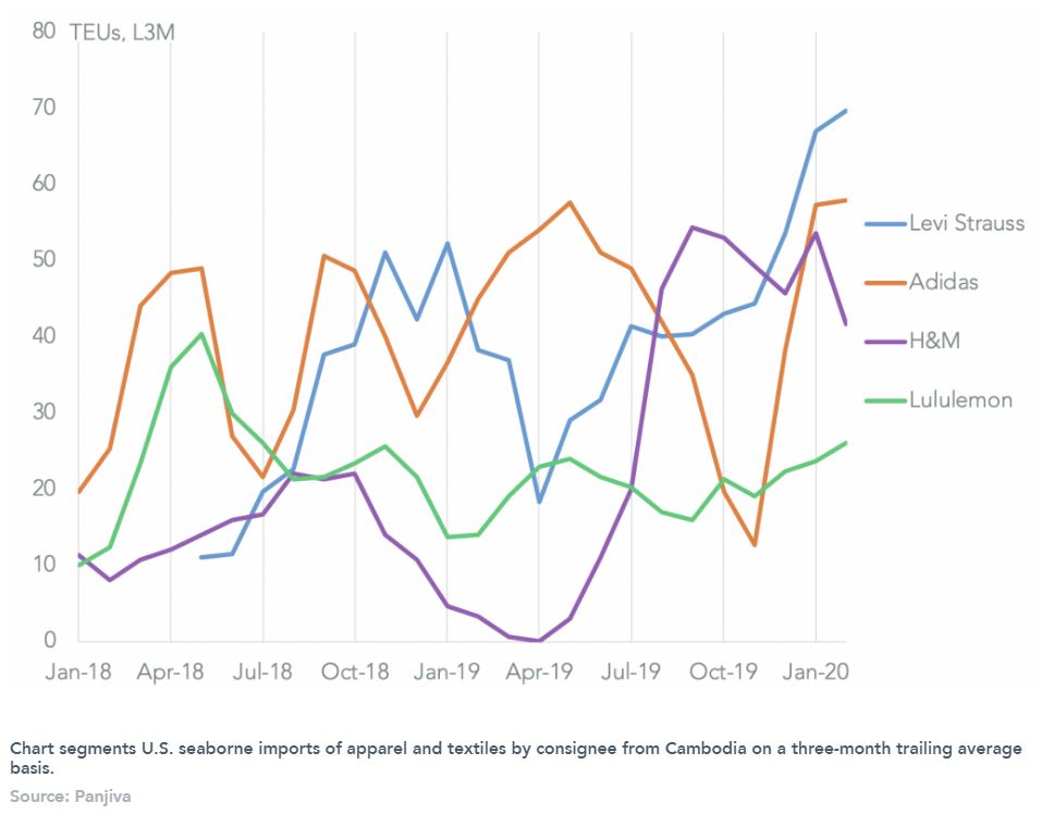 Firms are facing both direct and indirect challenges to their supply chains. At a high level the Cambodian government has warned about a second-order effect for customers of Cambodian factories resulting from fabric shortages from China. Levi Strauss and Adidas have rapidly increased their imports to the U.S. from Cambodia recently – while their sourcing of completed goods is diversified they may not be so in fabrics.