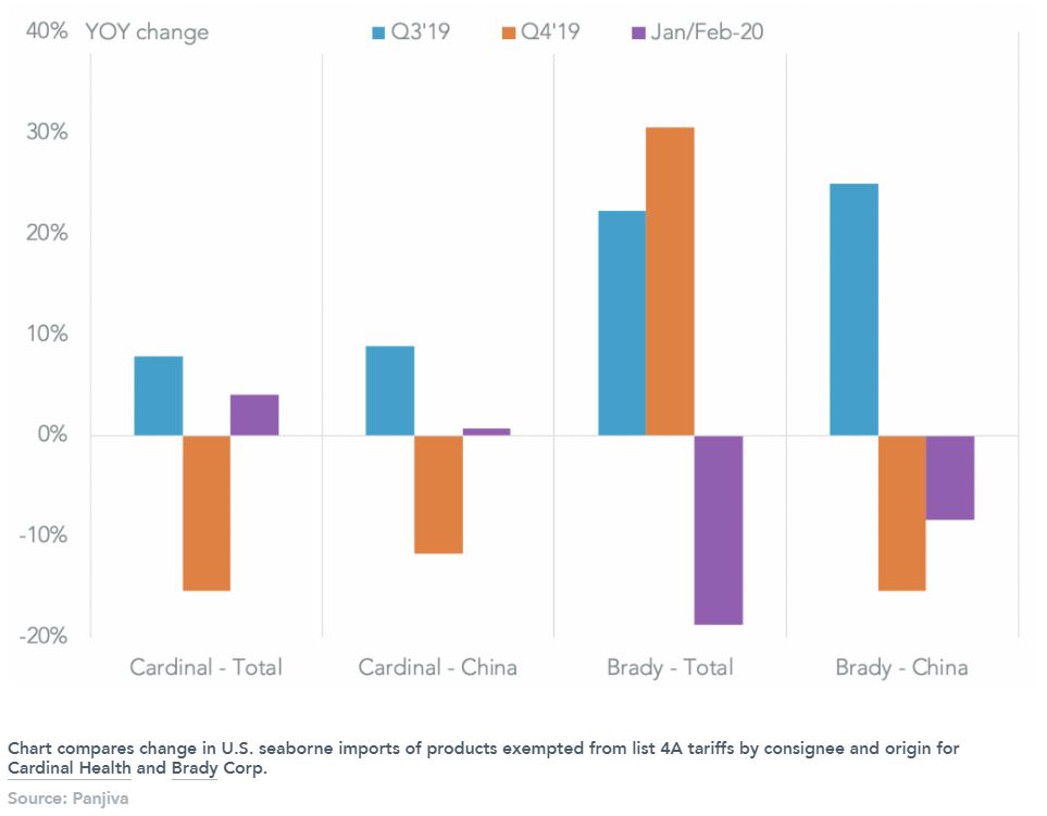 The potential for increased costs has led the U.S. government to remove tariffs on medical supply imports from China. The exemptions cover 10 products where imports from China were worth $3.68 billion in 2019. That may help imports associated with Cardinal Health and Brady Corp who rely on China for 59.4% and 31.6% respectively of their U.S. seaborne imports.