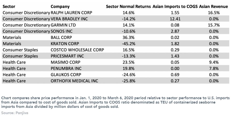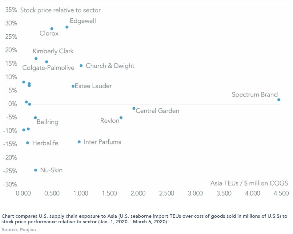 The following analysis considers the proportion of each companies’ supply chain in the U.S. drawn from Asia and the proportion of revenues from Asia in comparison to sector-relative stock-price performance between Jan. 1, 2020 and March 6, 2020. The supply chain measure is calculated as the TEUs (20-foot equivalent unit) of containerized freight imports from Asia per dollar of cost of goods sold in the most recently reported full year. The revenue measure is based on companies’ self-reported data and as such has a lower level of completeness.