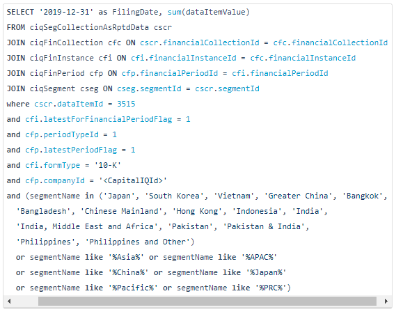 To find revenues, join the Capital IQ segment collection, financial collection, financial instance, financial period, and segment tables together on the below fields. Filter for the data item 3515, geographic segmentation, and the flags for period type, latest period, and form types. Restrict the query to the relevant Capital IQ id, and then filter for various asian countries in the free text descriptions. The filter shown uses a mix of the like operator and exact matches to cover a wide range of options.