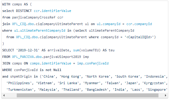 Finding Asian imports in panjiva data uses the Panjiva U.S. import dataset for 2019. Create a subquery for company resolution from Capital IQ id to Panjiva Id, then join that subquery to panjiva imports. Filter for Asian shipment origins and select wanted fields.