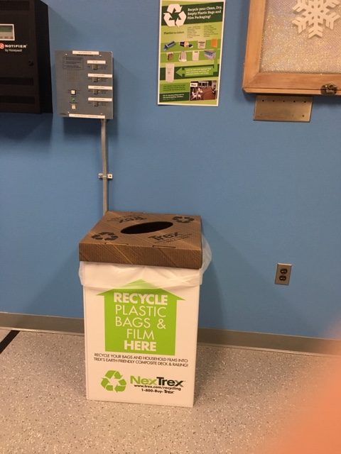 Bins for the collection of plastic bags and film plastic have been installed in several West Hartford locations, including this one at the Elmwood Senior Center. Courtesy of Diane Mack