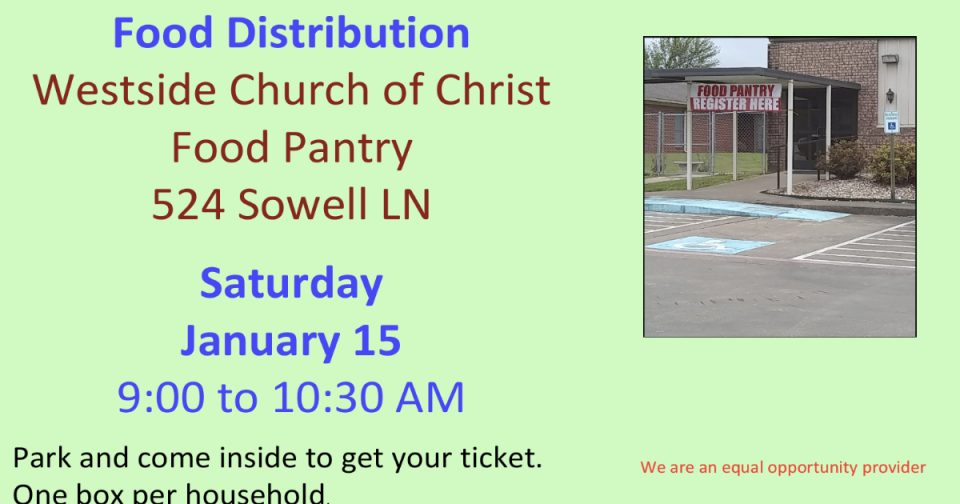 The Westside Church of Christ food distribution will be on Saturday, Jan. 15, from 9:00AM to 10:30AM. Once again we have prepared plenty of boxes for anyone who needs help with food. We know that your grocery bill has gone up. Please do not hesitate to come if you need food. The 25 pound food boxes contain a variety of meats, vegetables, fruits, and pasta. We welcome everybody!