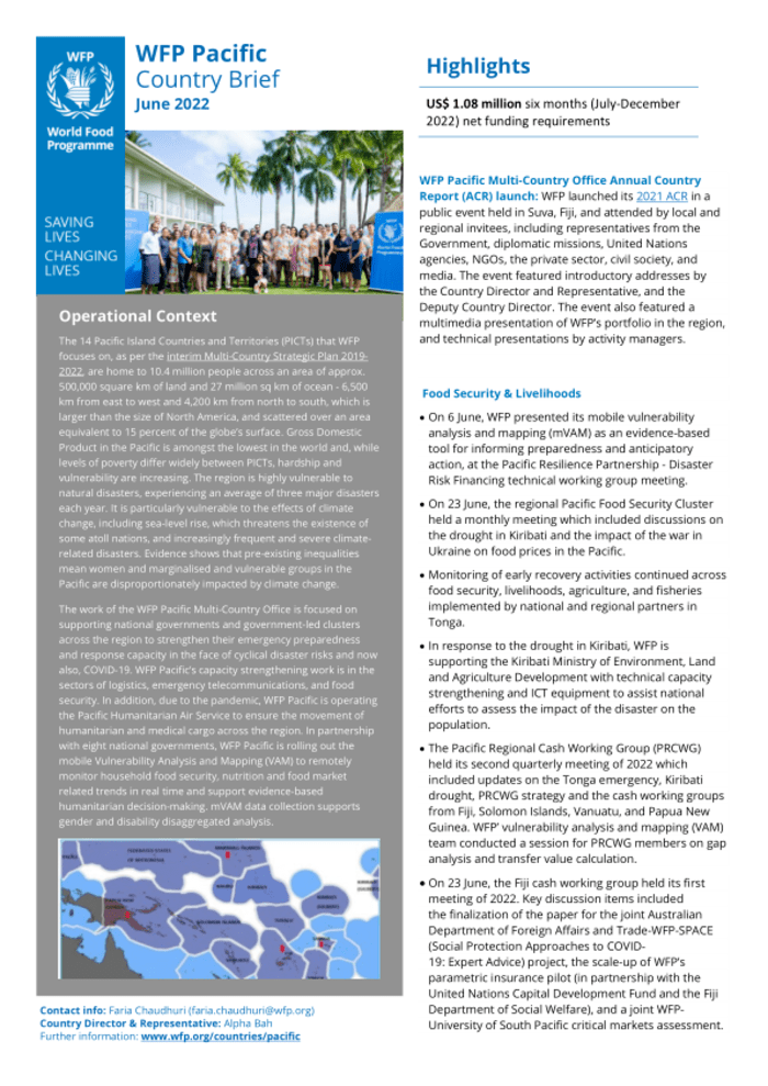 • On 23 June, the regional Pacific Food Security Cluster held a monthly meeting which included discussions on the drought in Kiribati and the impact of the war in Ukraine on food prices in the Pacific.
