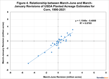 Figure 4 shows the relationship between the March-June acreage revision for corn and the total March-January revision. The R2 for the regression is 88 percent, which shows that all but a small proportion of the total revision is revealed in the June Acreage report.