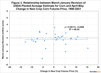 The April-May period brackets the period when the vast majority of adjustments in corn and soybean acreage decisions can be made in response to price changes. Figure 3 shows the revisions to USDA planted acreage estimates for corn over 1990-2021 and new crop futures prices changes in April-May.