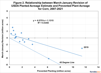 We examine the historical relationship between USDA planted acreage revisions and prevented plant acreage for corn over 2007-2021 in Figure 2. The scatter of data has the expected downward slope, with larger prevented plant acreage tending to be associated with negative March-January USDA planted acreage revisions.
