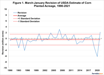 With a standard deviation of 1.9 million acres, the bands are roughly plus/minus two million acres. In other words, it is not unusual for the initial planted acreage estimates for corn found in the March Prospective Plantings report to be revised upward or downward as much as two million acres.