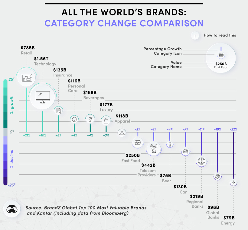 The above chart shows overall categorical changes for 2020 led by retail, tech, and insurance. In the opposite corner, energy, and bank brands took the biggest hits.