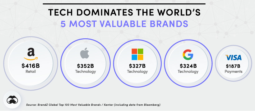 While the brand value growth rates of tech giants aren’t entirely immune to the effects of COVID-19, the likes of Apple, Microsoft, and Google are growing steadily, surpassed only by e-commerce leader Amazon.