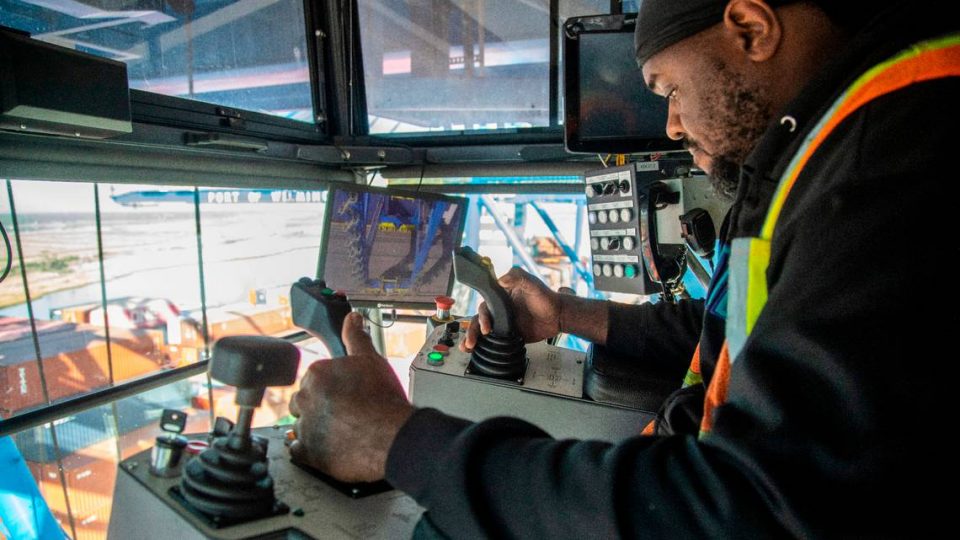 Crane foreman Tramel Johnson operates one of the cranes Wednesday, December 1, 2021 at the Port of Wilmington. The port is not experiencing backups seen at other U.S. first call ports but the port is being impacted by vessels that are delayed at other ports.