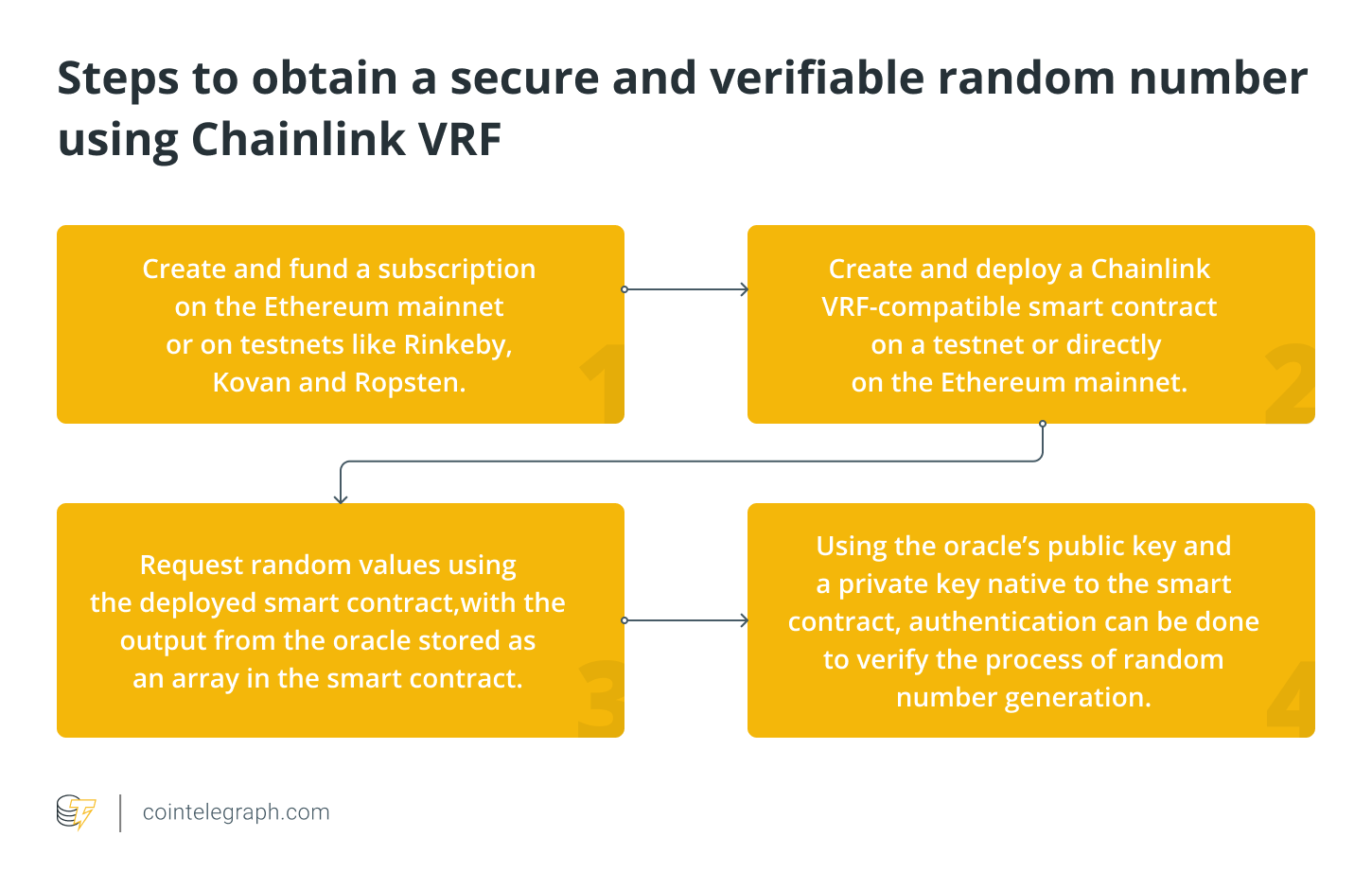A smart contract can utilize Chainlink VRF to obtain a secure and verifiable random number in four simple steps:
