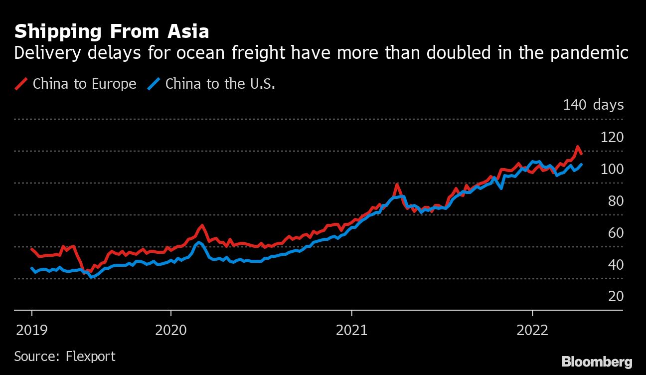 It is currently taking an average of 111 days for goods to reach a warehouse in the United States from the moment they’re ready to leave an Asian factory, close to the record of 113 set in January and more than double the time the trip took in 2019, according to San Francisco-based Flexport Inc., a freight forwarder. The journey to Europe takes even longer—a near-record 118 days.
