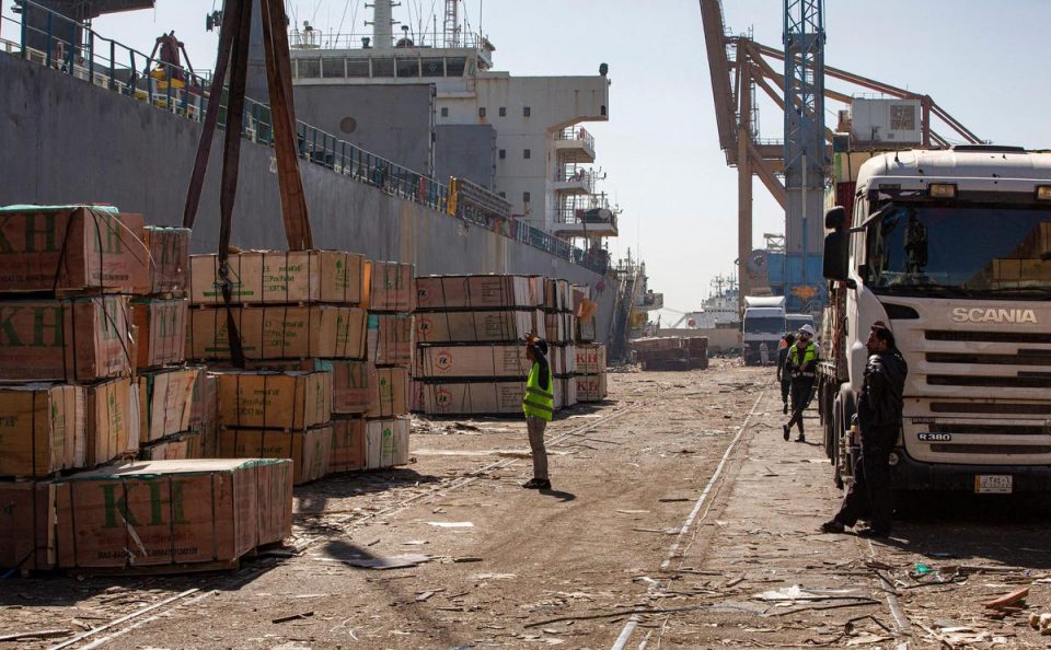 This picture taken on March 14, 2021 shows pallets of imported wood being unloaded off a cargo ship on the pier at the port of Umm Qasr, south of Iraq’s southern city of Basra. (Photo by HUSSEIN FALEH/AFP via Getty Images)