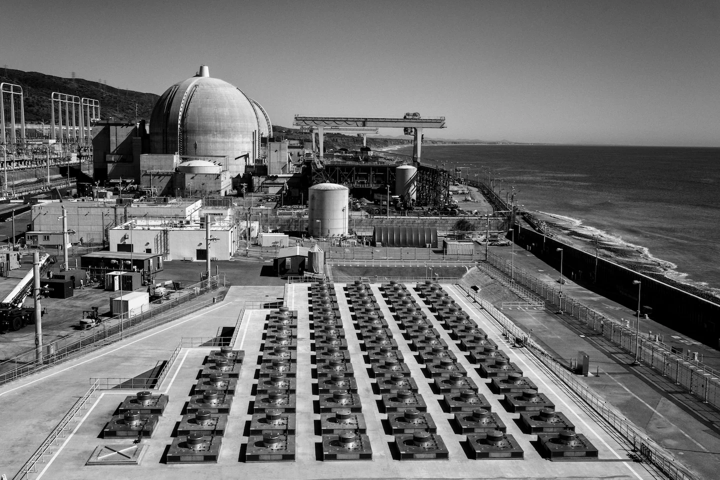 Out on the concrete pad, in my immediate vicinity, I could see a partially demolished industrial site; farther out, it looked like a commercial for a seaside vacation. The pad is elevated above sea level, but the ocean is about 100 feet away, behind a sea wall. “Dry fuel storage is very self-sufficient,” Stephenson said. “There’s no fans, there’s no cooling systems; it just sits there, fat, dumb and happy, as I like to say.”