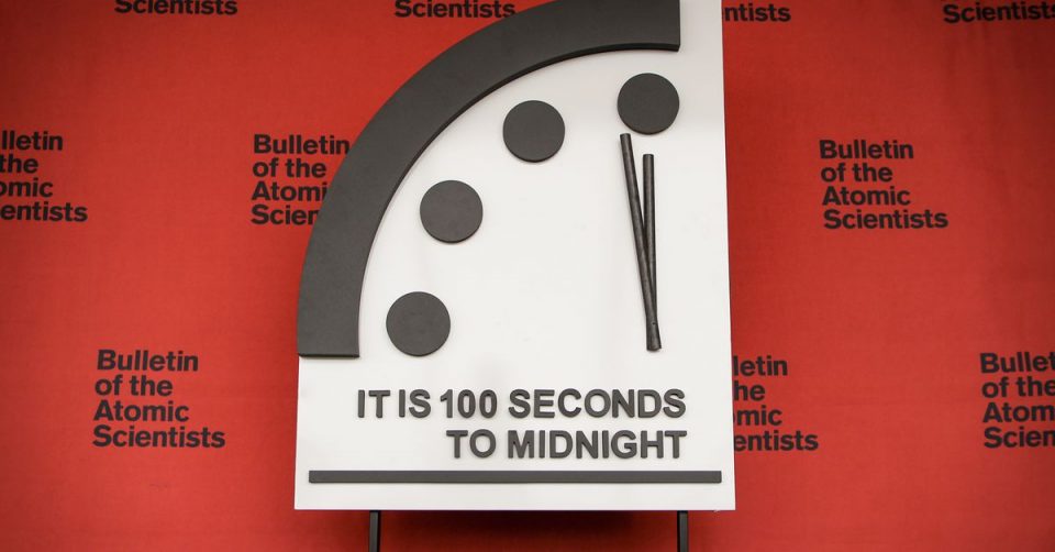 One hundred seconds to midnight. That’s the latest setting of the Doomsday Clock, unveiled yesterday morning by the Science and Security Board of the Bulletin of the Atomic Scientists.
