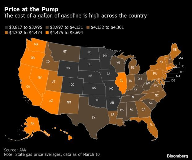 - Inflation-walloped Americans are largely prepared to withstand the economic pain imposed by Russia’s invasion. But that may be little solace for Democrats, who will pay a price at the ballot box for the surging cost of living, if history is any guide. Consumer prices were already surging at their fastest pace in four decades even before the hit to energy and food supply chains caused by the war and sanctions imposed by the U.S. and its allies on Russia. Gasoline prices are already up 20% this month, reaching an unprecedented $4.33 a gallon. Reade Pickert and Gregory Korte have more.