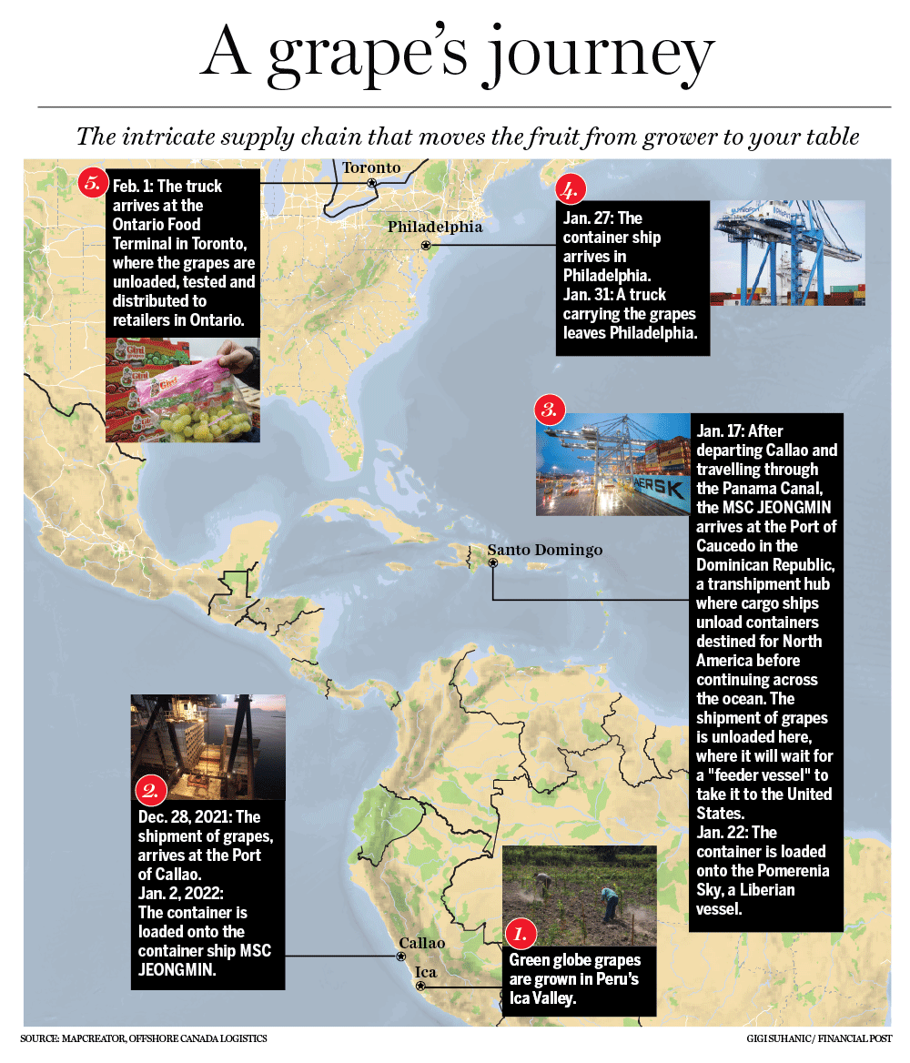 By now, the grapes have sailed two seas, on two ships, through a handful of major ports, across two continents, and if their stems are too brown, if their flesh is too blemished, if they aren’t as crunchy as expected, this great voyage could end at the bottom of a garbage bin, or wallowing unloved on a retail shelf or in a crisper drawer.