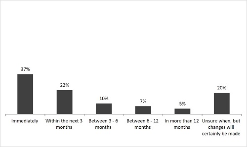 Based on reader responses, a majority of those changes (69%) in plans are happening in a relatively short time, ranging from immediately (37%), to within the next 3 months (22%) and between 3 and 6 months (10%).