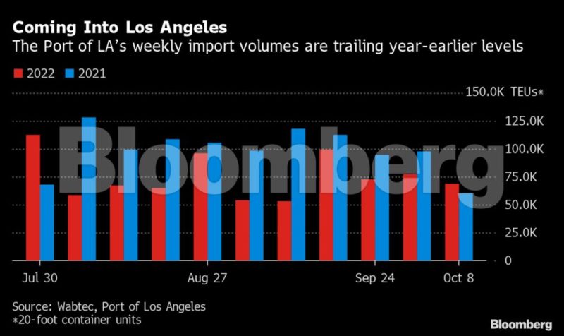 Evidence of the shipping slowdown is also seen in weekly traffic figures at the busiest US port in Los Angeles, where 17 container ships were berthed on Thursday, compared with about 30 in early 2022. The downturn has been gradual and nearby intermodal depots are still working through backlogs, but weekly import volumes lately are coming in lower than year-earlier levels. Part of it can be blamed on earlier-than-expected inventory stockpiling this summer, as well as the rerouting of goods through East Coast ports to avoid a possible strike: