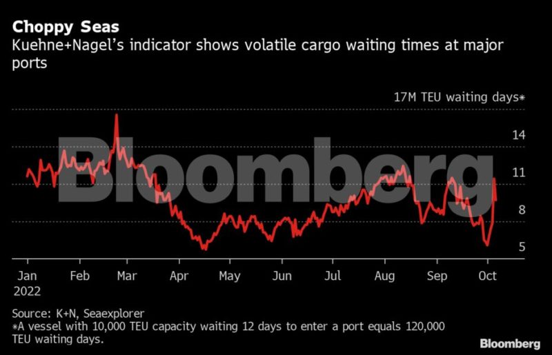 Here’s another disruption indicator, from Swiss freight forwarder Kuehne+Nagel International AG, showing a similar pattern — seaborne cargo congestion is lower than its early-2022 peak, but delays are still elevated in volatile economic times: