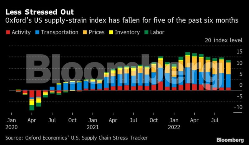 Similarly, an Oxford Economics indicator of supply strains in the US peaked in February and has slowly but steadily improved through September. It helps that consumers in developed economies are cinching their purse strings. “Supply chain conditions should stay on a more encouraging trajectory in the final stretch of 2022 and in 2023. One of the benefits of weakening demand is it will ease stress in supply chains,” said Oren Klachkin, Oxford’s lead US economist.